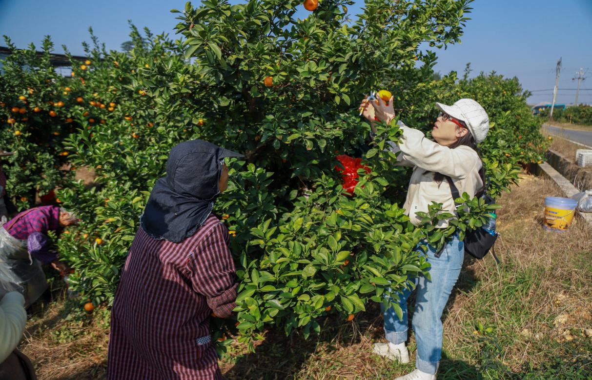 珊娜果园种植基地作为新余蜜桔的核心产区之一,漫山桔树枝繁叶茂,金黄果实缀满枝头,清甜果香在山间弥漫。在果农的专业引导下,江西工程学院的师生们迅速分组进入标准化种植区域,手持采摘剪刀与收纳袋,与农户并肩投入蜜桔采收劳作。