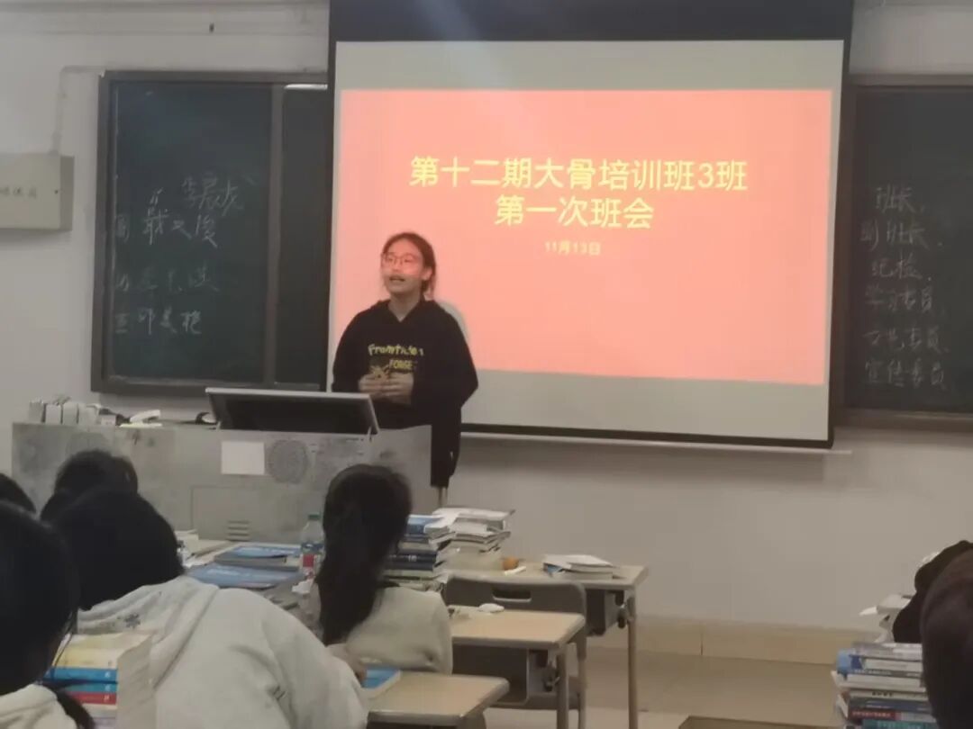 班会现场暖意融融,同学们以“姓名+标签”自我介绍、兴趣分享等形式逐一亮相,在班级中寻觅志同道合的伙伴。班委竞选环节时高潮迭起,学员们踊跃登台,结合自身优势阐述岗位设想与责任担当,台下的同学们慎重投票,最终选出一批责任心强、群众认可的班委骨干。班会尾声,大家共同重温大骨班培养初心,明确作为青年骨干的责任使命——既要在集体中锤炼自我,更要以先锋姿态践行青春担当。