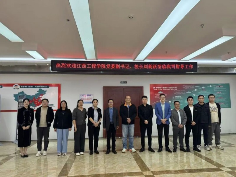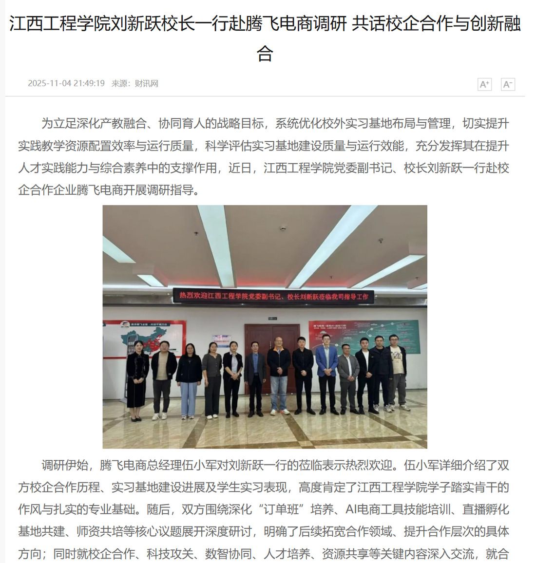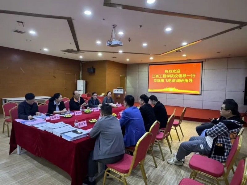 调研伊始,腾飞电商总经理伍小军对刘新跃一行的莅临表示热烈欢迎。伍小军详细介绍了双方校企合作历程、实习基地建设进展及学生实习表现,高度肯定了江西工程学院学子踏实肯干的作风与扎实的专业基础。随后,双方围绕深化“订单班”培养、AI电商工具技能培训、直播孵化基地共建、师资共培等核心议题展开深度研讨,明确了后续拓宽合作领域、提升合作层次的具体方向;同时就校企合作、科技攻关、数智协同、人才培养、资源共享等关键内容深入交流,就合作中的具体问题交换意见,最终在产教融合、科研成果转化、人才交流培养等领域达成深化合作共识。