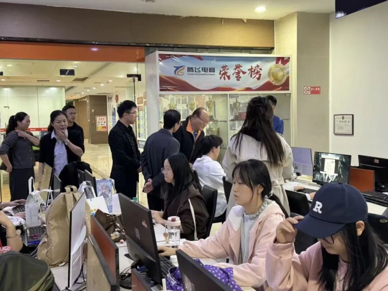 在实习现场,刘新跃一行深入直播运营、店铺管理、客户服务等实习工位,细致察看学生实操情况,详细询问实习项目设计、技能目标达成及岗位适配度等问题。看到同学们熟练运用电商运营工具处理订单、策划直播脚本、对接客户需求时,刘新跃不时驻足点赞,鼓励大家珍惜真实职场实习机会,将理论知识转化为实战本领,锤炼适应行业发展的核心竞争力。随后,刘新跃一行还仔细查看了腾飞电商的实习实训设备配置、安全管理规范及校企双师指导记录,全面掌握实习基地运行实际情况。