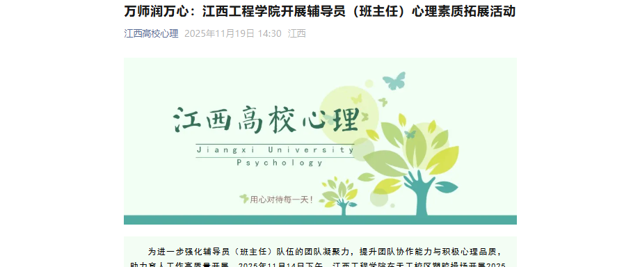 为进一步强化辅导员(班主任)队伍的团队凝聚力,提升团队协作能力与积极心理品质,助力育人工作高质量开展,2025年11月14日下午,江西工程学院在天工校区塑胶操场开展2025年秋季辅导员(班主任)“积极心理 凝心聚力”心理素质拓展活动。此次活动由学工处心理健康与咨询中心熊小红老师带队,来自各学院30余名辅导员(班主任)代表积极参与。