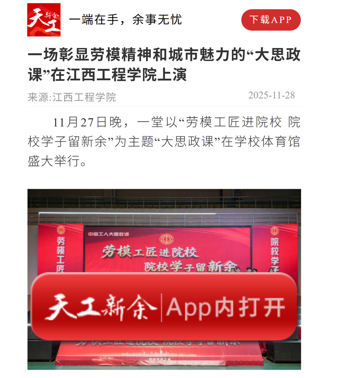 11月27日晚,一堂以“劳模工匠进院校 院校学子留新余”为主题“大思政课”在学校体育馆盛大举行。