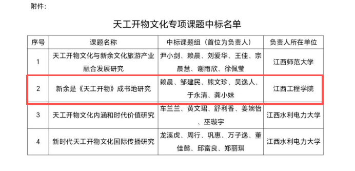 2025年11月28日,新余市社会科学界联合会、江西省天工开物文化研究会联合公示2025年度新余市天工开物文化专项课题中标结果,学校赖晨副教授主持的《新余是<天工开物>成书地研究》成功入选。此次学校与江西师范大学等省内高校同台跻身4个中标课题组之列,不仅印证了学校在天工文化研究领域的深厚积淀,更彰显了应用型高校在特色学术研究中的强劲实力。