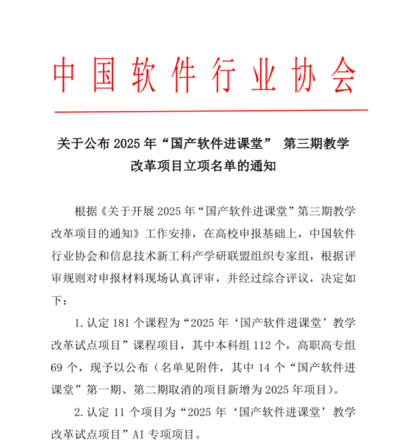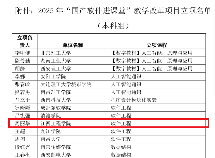 近期,中国软件行业协会发布了2025年“国产软件进课堂”教学改革项目立项名单,共有181门课程入选,其中本科组有112门。我校人工智能与数据科学学院周丽华教师团队申报的项目《软件工程(仓颉语言)》成功获批立项。