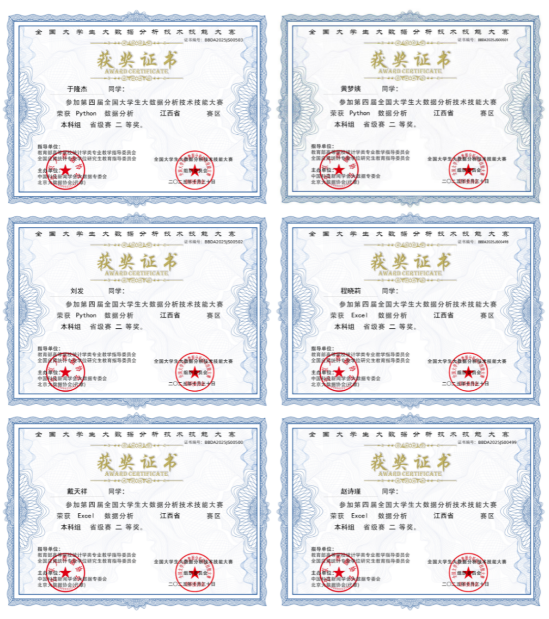 据悉,全国大学生大数据分析技术技能大赛是国内大数据分析领域的权威赛事,也是教育部认可的84项学科竞赛之一,大赛旨在检验和提升学生的大数据分析与应用能力。此次比赛中,在何璠、邓亮老师的悉心指导下,于隆杰、刘发、戴天祥、黄梦姨、赵诗瑾、程晓莉六位参赛学生积极备赛,在数据清洗、建模分析、可视化呈现等多个环节展现出过硬的专业素养,均获得省级二等奖。