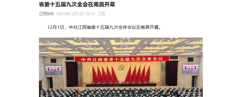 12月1日,中共江西省委十五届九次全体会议在南昌开幕。