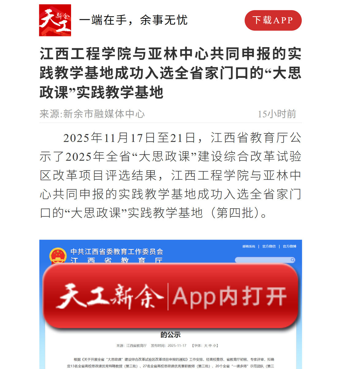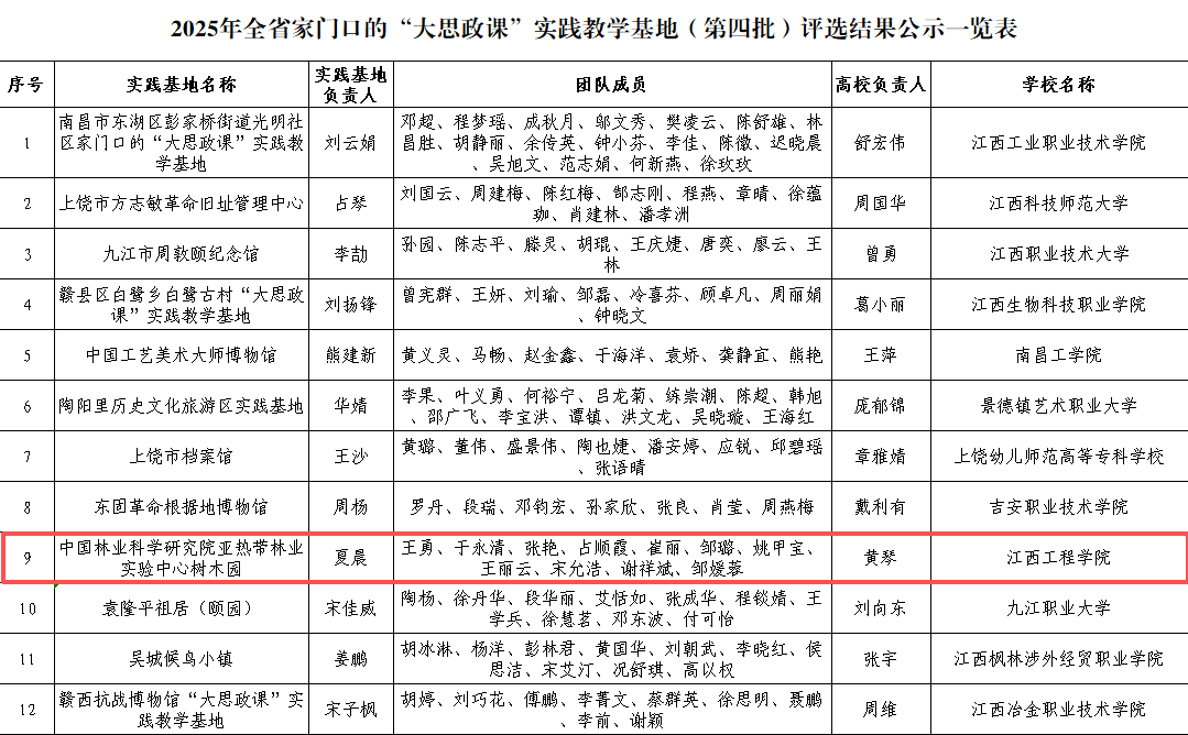 2025年11月17日至21日,江西省教育厅公示了2025年全省“大思政课”建设综合改革试验区改革项目评选结果,江西工程学院与亚林中心共同申报的实践教学基地成功入选全省家门口的“大思政课”实践教学基地(第四批)。