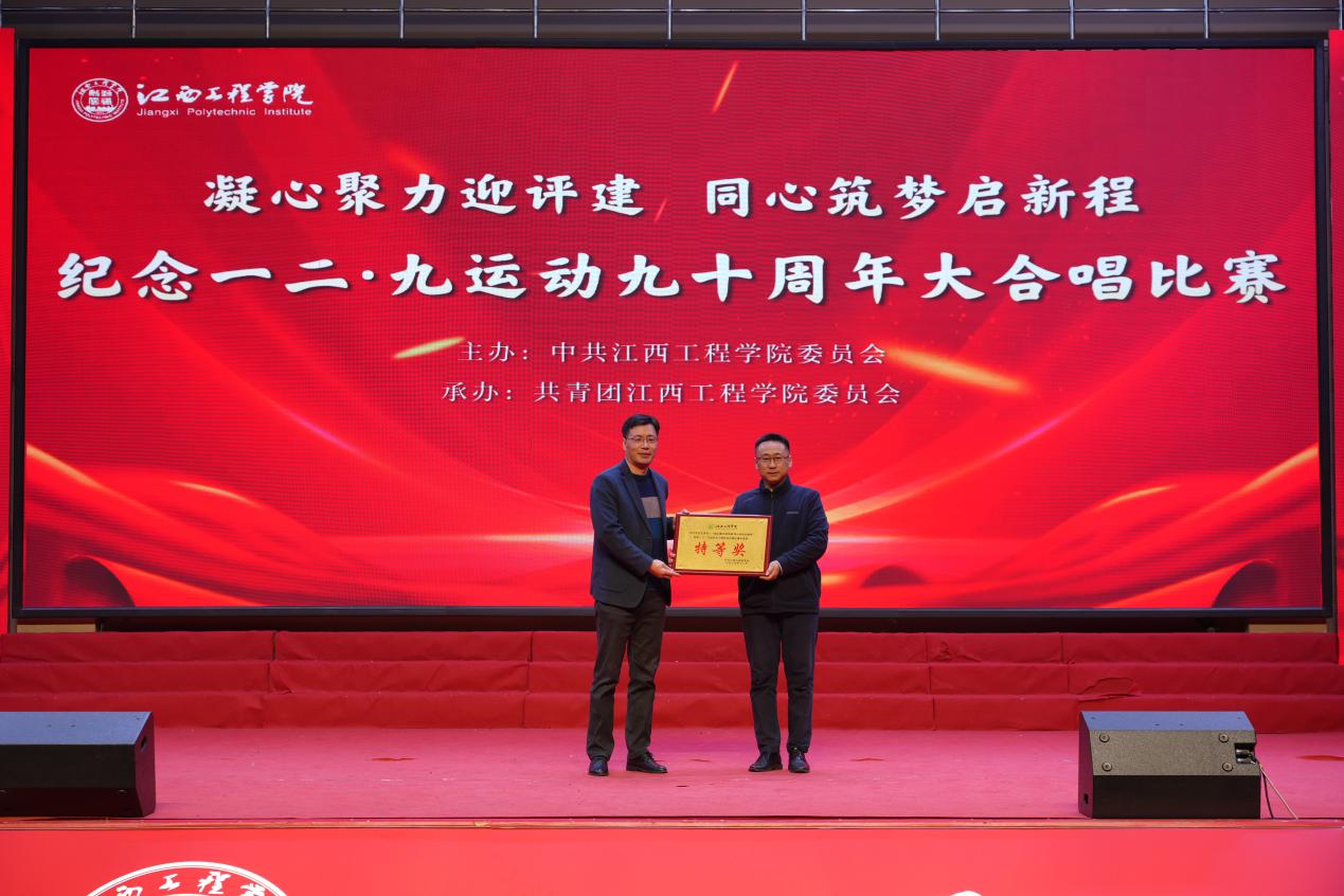 各参赛队的精彩表演,赢得了在场观众的阵阵掌声。经过激烈角逐,抱石艺术学院摘得比赛特等奖、经济管理学院荣获一等奖、智能制造与建造学院荣获二等奖、语言与传播学院(国际教育学院)荣获三等奖,电子信息工程学院、人工智能与数据科学学院、智慧产业学院荣获优秀奖。评委嘉宾为获奖队伍代表颁奖并合影留念。