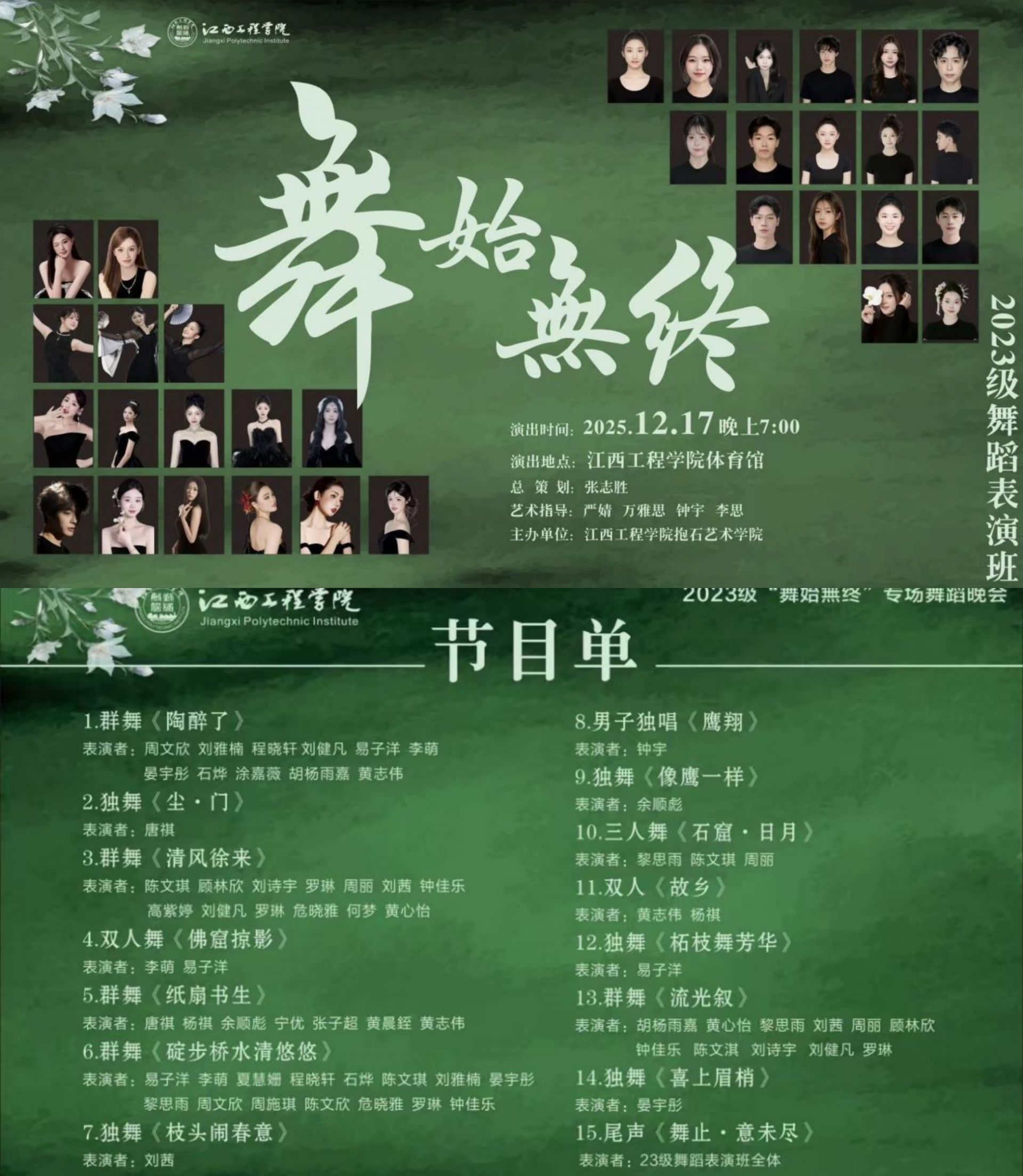 12月17日晚7点,江西工程学院体育馆内灯火通明、座无虚席。由抱石艺术学院主办的“舞始無终”2023级舞蹈表演专业毕业汇演在此盛大举行,吸引了全校师生踊跃观看,共同见证了一场属于青春的舞蹈盛宴。