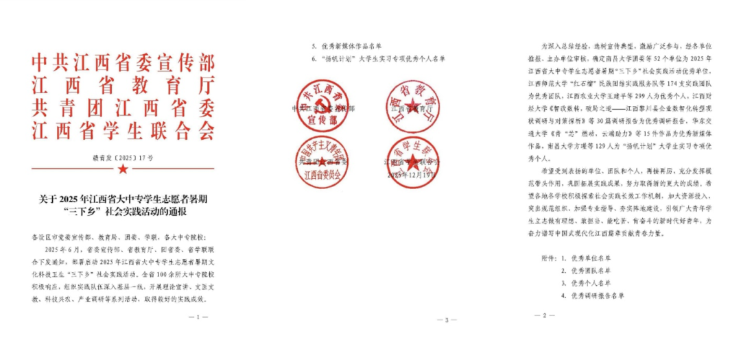近日,我校在中共江西省委宣传部、江西省教育厅、共青团江西省委、江西省学生联合会联合开展2025年江西省大中专学生志愿者暑期“三下乡”社会实践表彰评选中喜获佳绩,多个个人与团队获得表彰,充分展现出学校实践育人工作的扎实成效与青春风采。