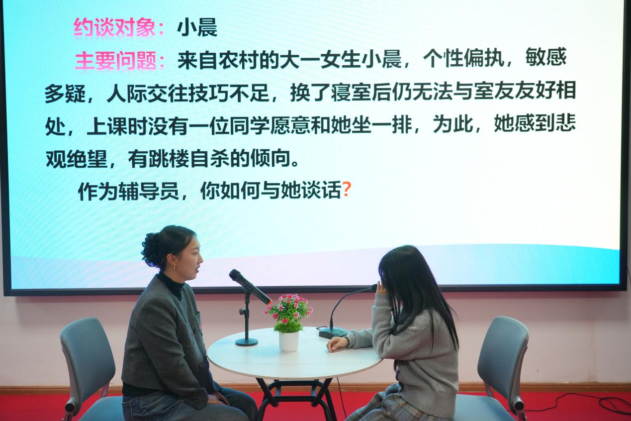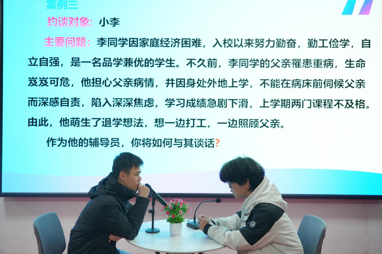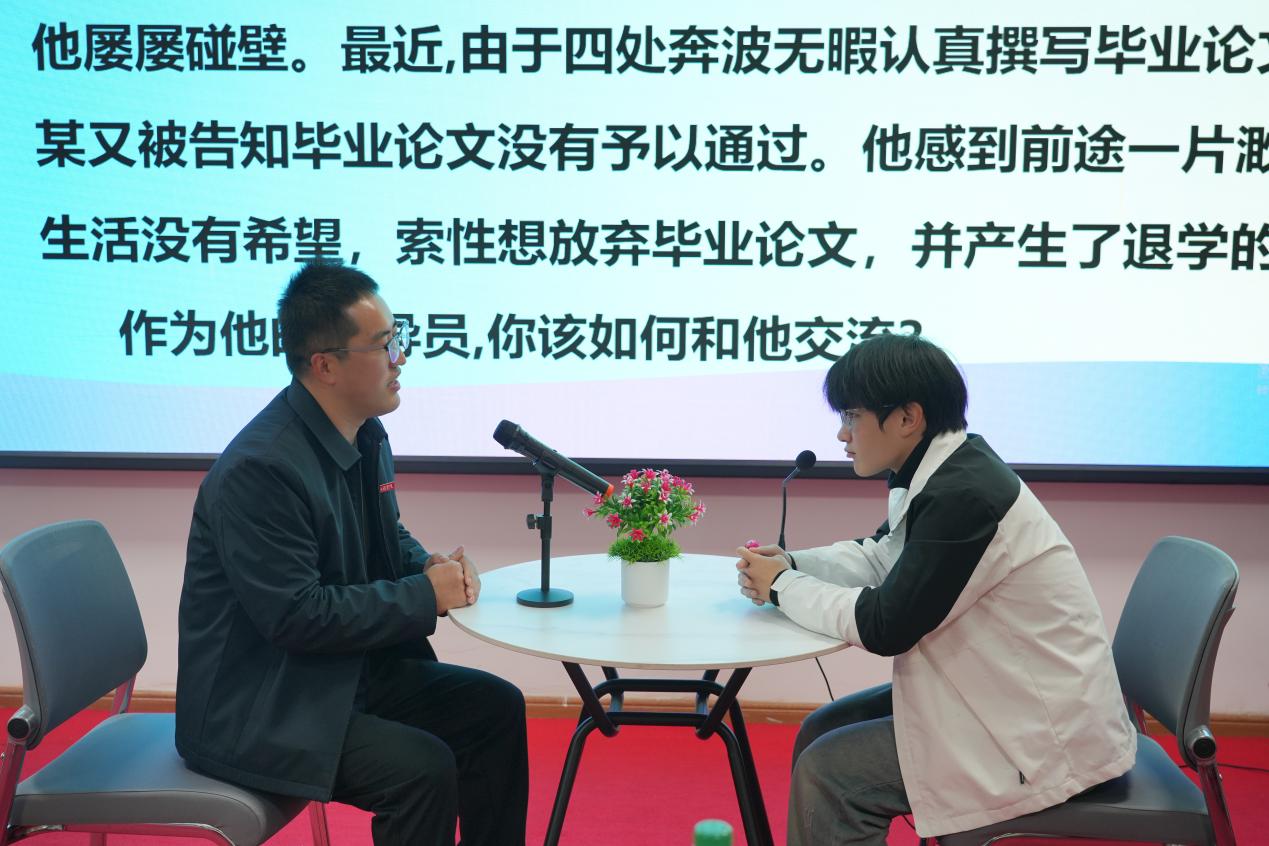 谈心谈话环节中,选手们提前抽题,遵循“人题匹配、同院规避”原则与学生模拟沟通,以真诚的态度、专业的技巧化解学生困惑,谈话后的总结反思与评委问答,进一步彰显了辅导员对学生成长规律的把握与教育引导能力。