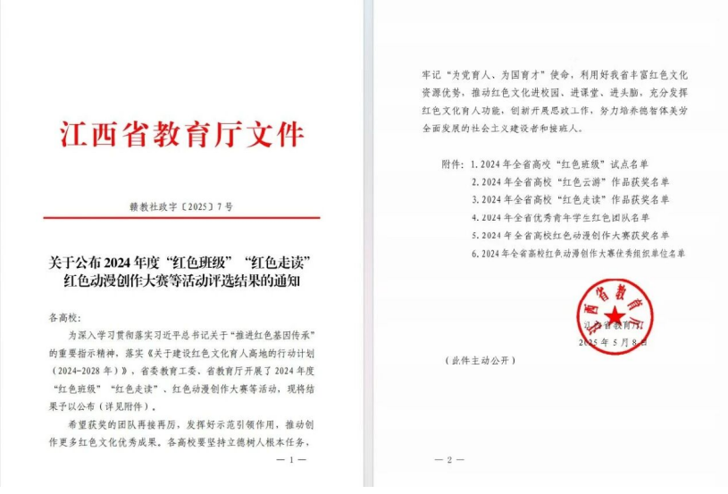 2025年5月,江西省教育厅公布了2024年度“红色班级”“红色走读”红色动漫创作大赛等活动评选结果的通知。抱石艺术学院《江西红色走读:记忆中的烽火岁月》作品获全省高校二等奖。
