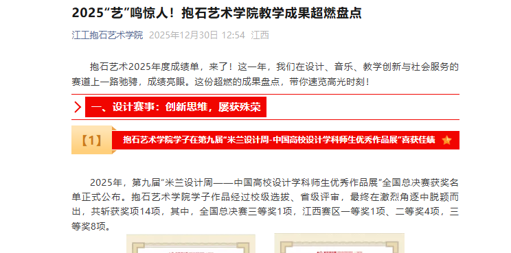 2025年12月,抱石艺术学院学子在2025年江西省新余市文化创意产品设计大赛获得一等奖1项、二等奖4项、三等奖5项,优秀奖12项,连续三年在服务地方,帮助企事业单位提升视觉形象,为地方文化打造特色IP,促进文旅消费升级,并通过线上线下多渠道推广,有效提升了新余城市文化形象和产业附加值,推动文旅融合发展。