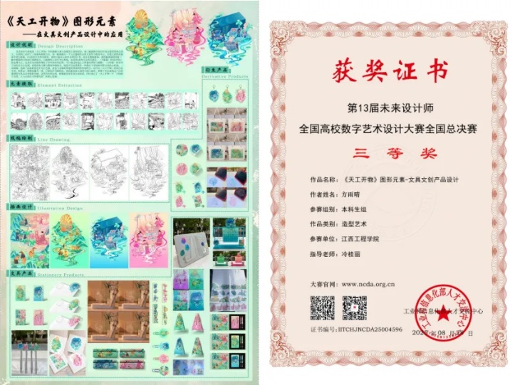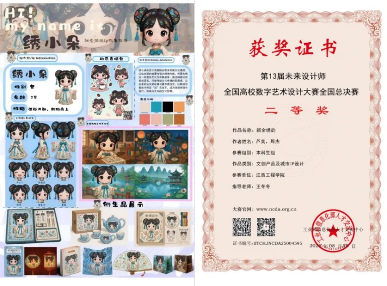 2025第13届未来设计师·全国高校数字艺术设计大赛自5月启动以来,学院高度重视,经过校级,省级选拔与决赛的层层筛选,江西工程学院抱石艺术学院程丽莹、周思颖、杜聿成、余菲菲、林雪梅、王雨欣、邝丽娜、古文意、向思思、刘爱玲、吴正威、刘林盛、陈洪斌、马宛玉、张佳艺、傅婷婷、董菲菲、张婉婧、杨烁、李丽云、王旋、粟桢浈、程雨婷、郭名辉、芦奕、周杰、方雨晴同学荣获省级一等奖2项,二等奖3项,三等奖11项,芦奕、周杰、方雨晴同学成功晋级全国总决赛,最终荣获全国总决赛二等奖。
