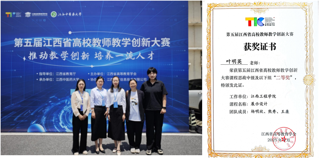 在第五届江西省高校教师教学创新大赛中,我校环境设计教研室《展示设计》教学团队教师凭借教学理念的前沿性、教学设计的系统性与课堂实施的有效性,叶明英老师荣获第五届江西省高校教师教学创新大赛课程思政中级及以下组二等奖,体现了在教学改革与创新实践中的积极探索。