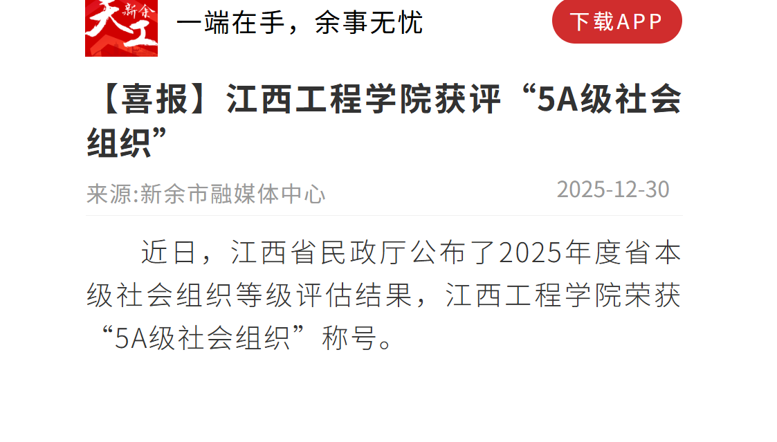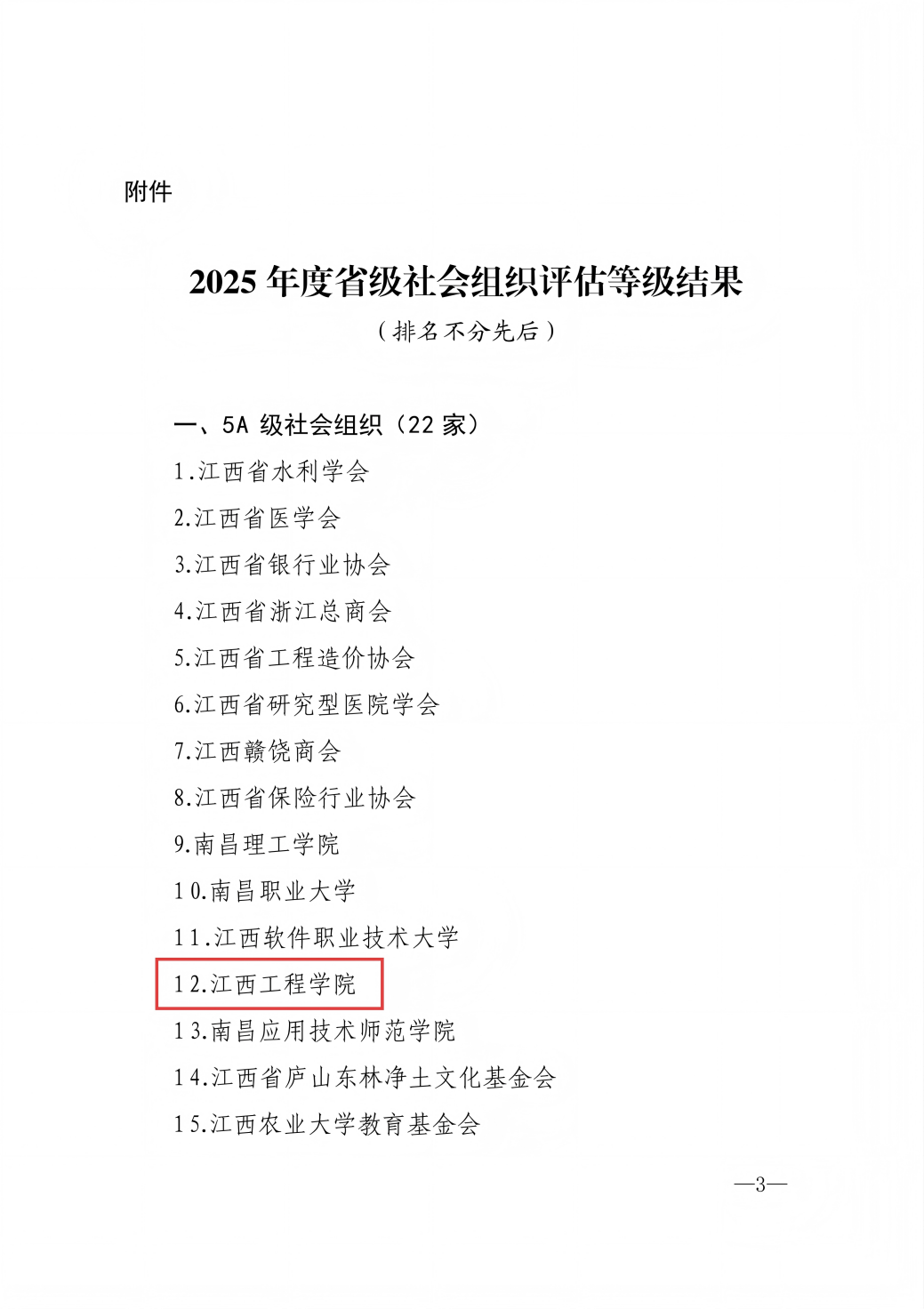 近日,江西省民政厅公布了2025年度省本级社会组织等级评估结果,江西工程学院荣获“5A级社会组织”称号。
