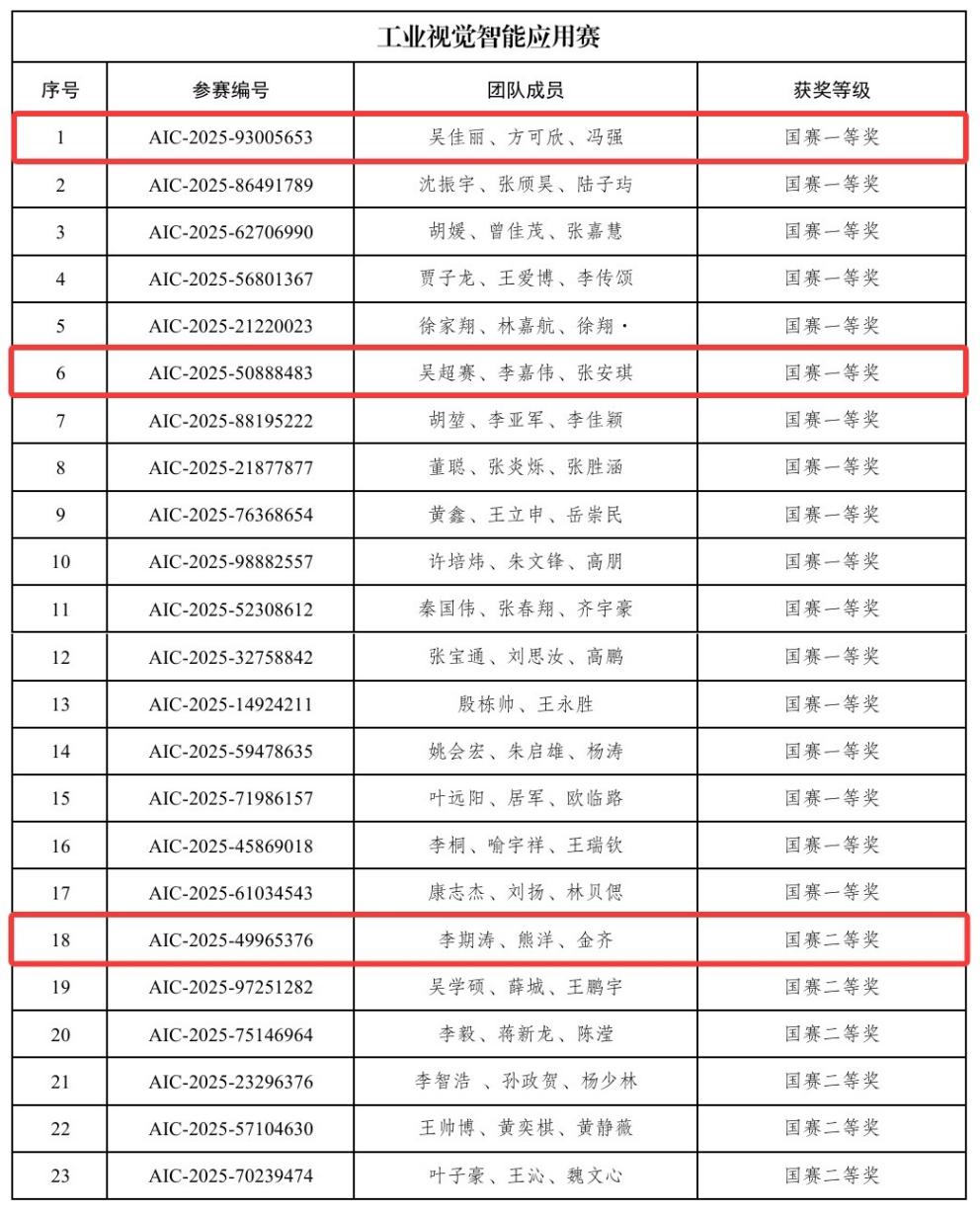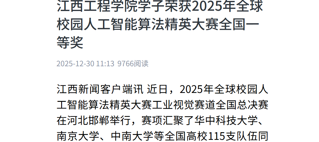 江西新闻客户端讯 近日,2025年全球校园人工智能算法精英大赛工业视觉赛道全国总决赛在河北邯郸举行,赛项汇聚了华中科技大学、南京大学、中南大学等全国高校115支队伍同台竞技。江西工程学院人工智能与数据科学学院机器人工程专业的三支学生队伍,凭借专业功底、稳定的临场发挥与创新性的技术方案,一举斩获全国一等奖2项(位列该赛道全国第一名),全国二等奖1项。