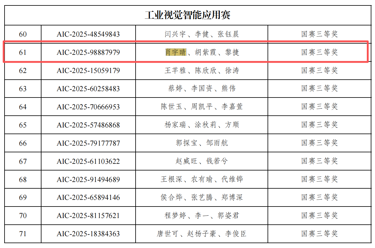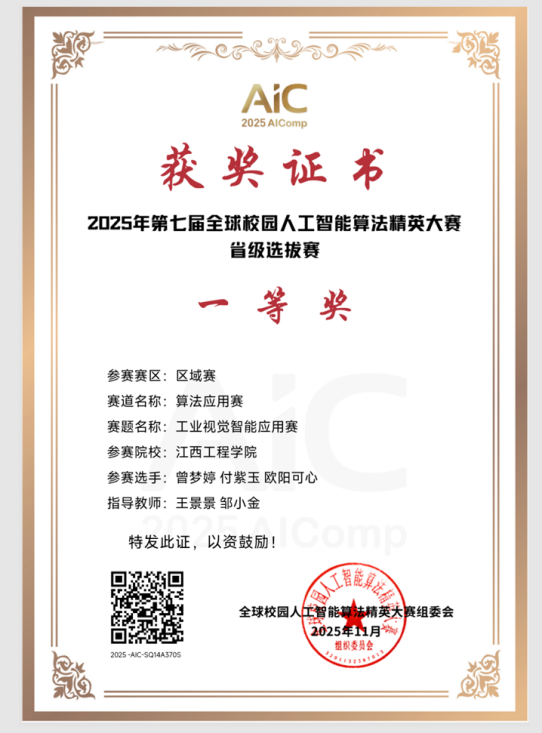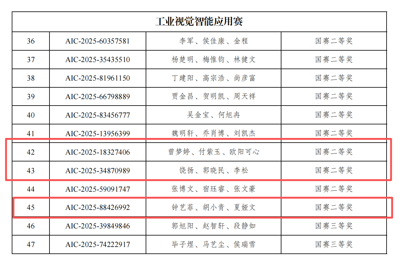 在省级选拔赛阶段,我校机器视觉工作室的参赛队伍同样表现出色,创下全团获奖的优异成绩:2支队伍勇夺一等奖,4支队伍斩获二等奖,4支队伍喜获三等奖,另有4支队伍获评优秀奖。获奖覆盖面广、奖项层次高,不仅展现了学校在人才培养方面的显著成效,更凸显了学子们在人工智能算法工业视觉应用领域扎实的专业实力与强劲的竞争力。
