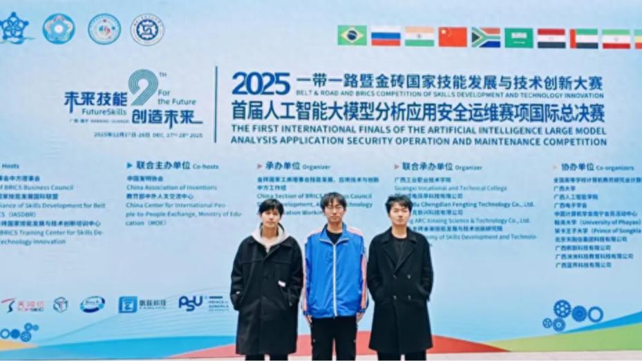 近日,2025年“一带一路”暨金砖国家技能发展与技术创新大赛首届人工智能大模型分析应用安全运维赛项国际总决赛在广西南宁圆满落幕。这场汇聚多个国家和地区顶尖院校的国际顶级赛事,我校人工智能与数据科学学院参赛团队(杨钧、涂领先、陈凯),凭借自主研发的原创大模型,在激烈角逐中脱颖而出,成功斩获国际总决赛二等奖,并荣获优秀组织奖,为学校赢得了荣誉,充分彰显了江工学子在人工智能领域的过硬实力与创新风采!