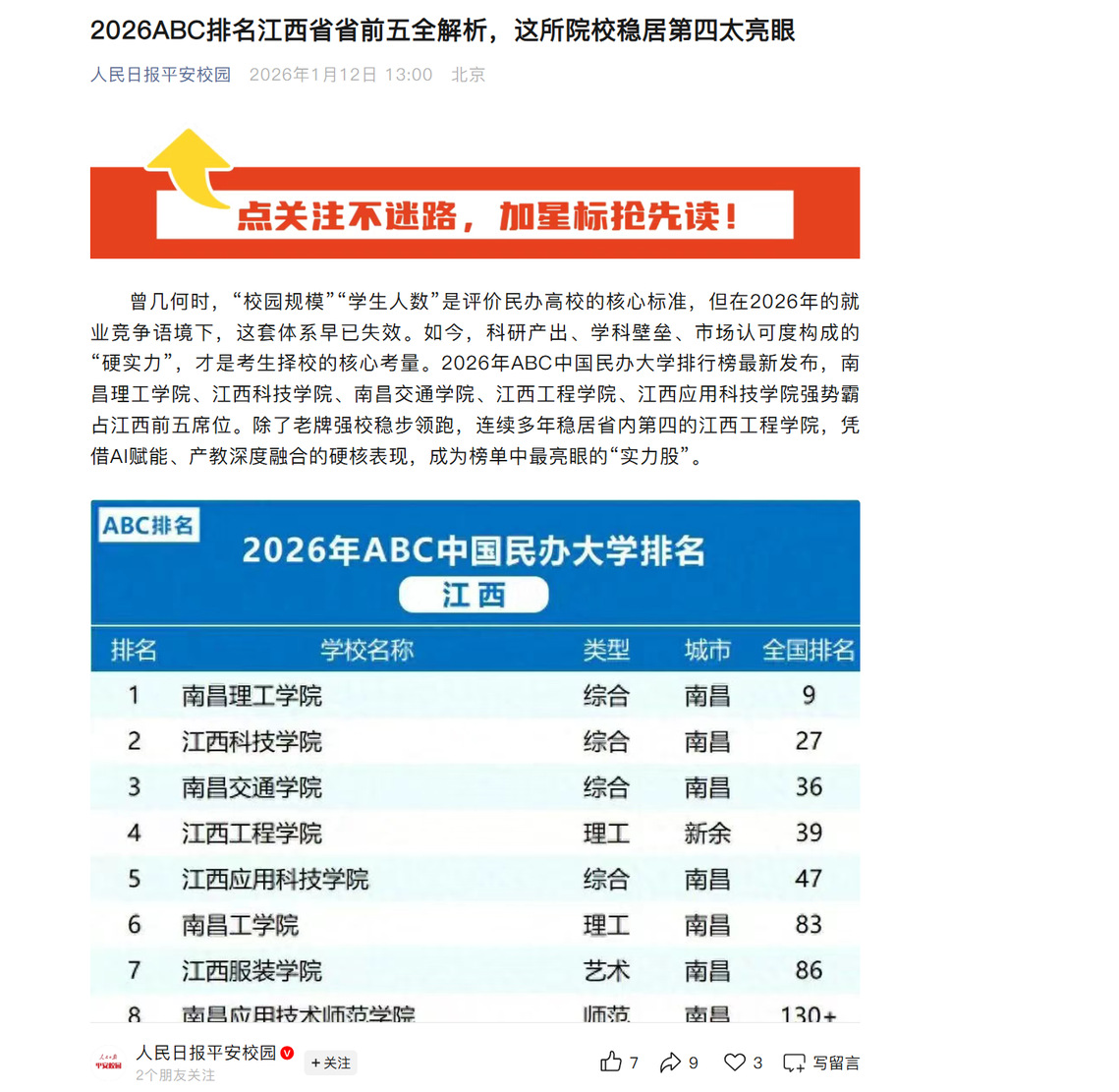 曾几何时,“校园规模”“学生人数”是评价民办高校的核心标准,但在2026年的就业竞争语境下,这套体系早已失效。如今,科研产出、学科壁垒、市场认可度构成的“硬实力”,才是考生择校的核心考量。2026年ABC中国民办大学排行榜最新发布,南昌理工学院、江西科技学院、南昌交通学院、江西工程学院、江西应用科技学院强势霸占江西前五席位。除了老牌强校稳步领跑,连续多年稳居省内第四的江西工程学院,凭借AI赋能、产教深度融合的硬核表现,成为榜单中最亮眼的“实力股”。
