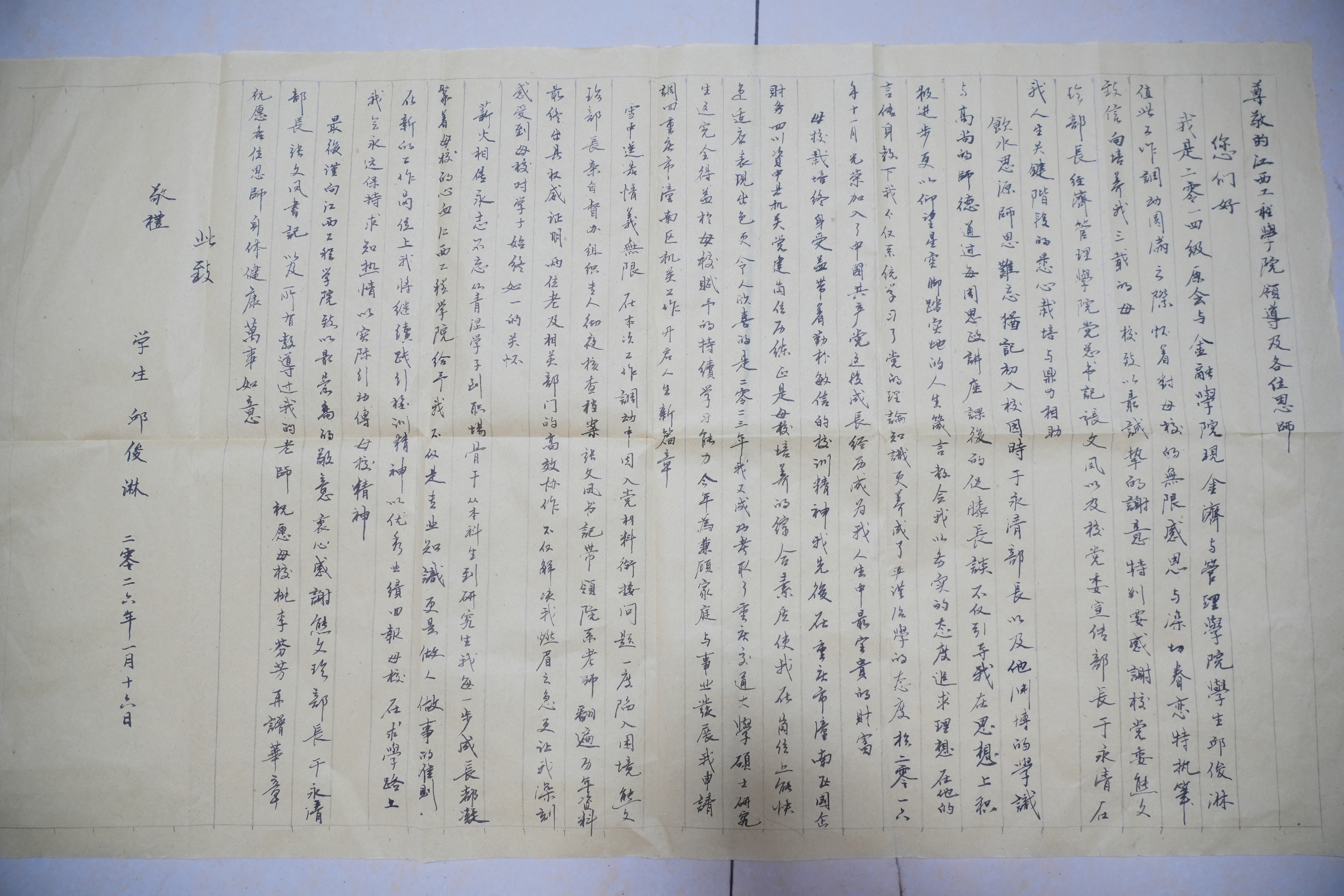 近日,江西工程学院2014级经济与管理学院(原会计与金融学院)会计专业校友邱俊淋,用传统文化形式——书法展示,专程向母校寄来一封饱含深情的感谢信。信中,他回顾了毕业九年来的成长轨迹,感念母校“勤朴敏信”校训精神的指引,更对校领导、恩师在其工作调动关键节点的鼎力相助表达了由衷谢意,字里行间满是对母校的眷恋与感恩。