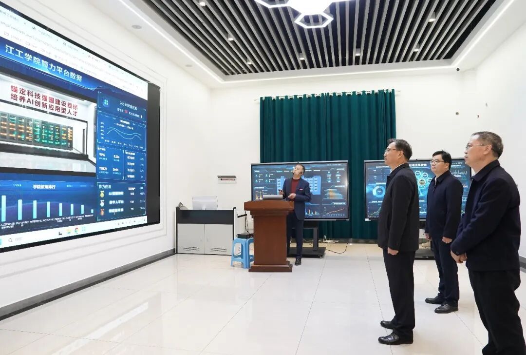 江工算力中心是集教学、科研与创新于一体的智能化算力平台。郑光泉详细了解AI课程助教、AI数字替身、AI就业导师等AI应用,对学校持续推动课程教学多样化、人才培养创新化、教学资源实效化给予肯定,鼓励学校顺应AI时代潮流,锚定科技强市建设目标,大力培养AI创新应用型人才。