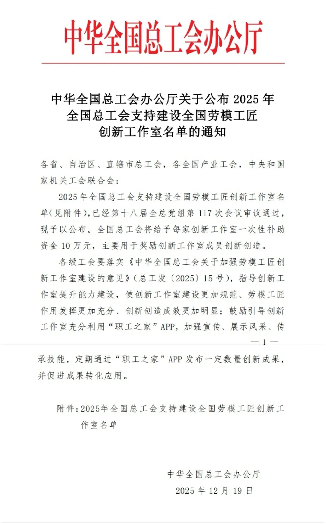 2025年12月,中华全国总工会办公厅正式公布2025年全国劳模工匠创新工作室支持建设名单,宁波中大力德智能传动股份有限公司“万亚勇劳模工匠创新工作室”凭借深厚的技术积淀与突出的创新成果成功入选,获国家级专项支持!工作室领衔人万亚勇系江西工程学院杰出校友,这一荣誉既是对其个人工匠精神的高度认可,更是江西工程学院“勤朴敏信”校训育人成效的生动彰显。