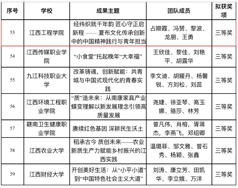 (本网讯 于永清 报道)近日,江西省教育厅公示的全省高校思政课教师“一线课堂”活动成果获奖名单中,由我校马克思主义学院占顺霞牵头的教师团队选送的作品《经纬织就千年韵 匠心守正启新程 —— 夏布文化传承创新中的中国精神践行与青年担当》荣获三等奖。此次评选活动中,全省共有229项“一线课堂”活动成果参与申报,经专家评审,共评选出73项作品拟获一、二、三等奖。