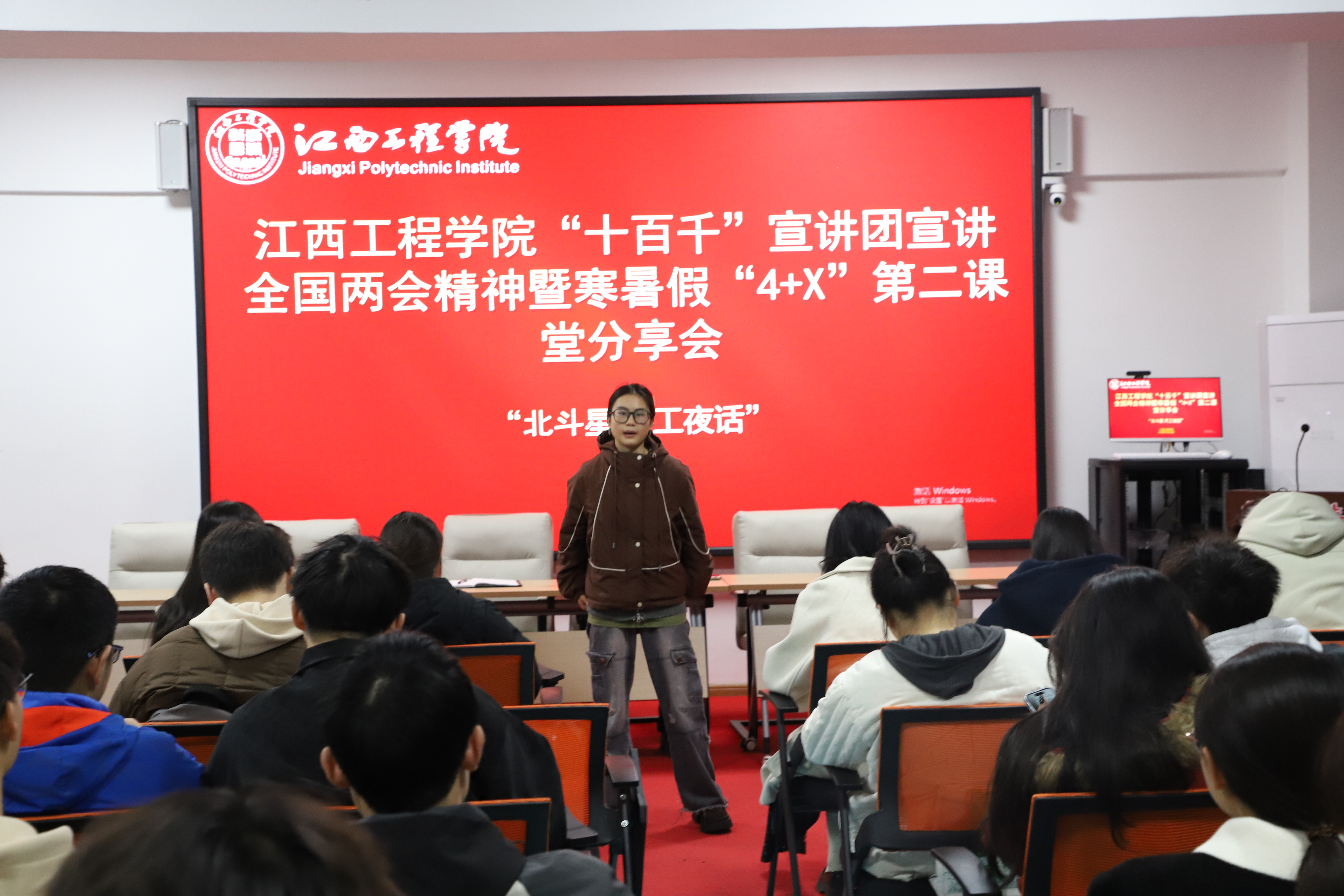 春潮涌动处,奋进正当时。3月27日晚,江西工程学院“一站式”学生社区灯火通明,“北斗星・天工夜话”2026年第1期活动如期举行。本次活动以“全国两会精神宣讲+本科教学工作合格评估动员+寒假‘4+X’实践分享”为核心内容,通过理论解读、政策宣讲、经验交流等形式,为来自抱石艺术学院、经济管理学院等4个学院的60余名团学干部及辅导员代表搭建了思想引领与实践交流的平台。活动由学工部副部长周卫忠主持,马克思主义学院直属党支部书记于永清、辅导员李桃分别作专题宣讲。