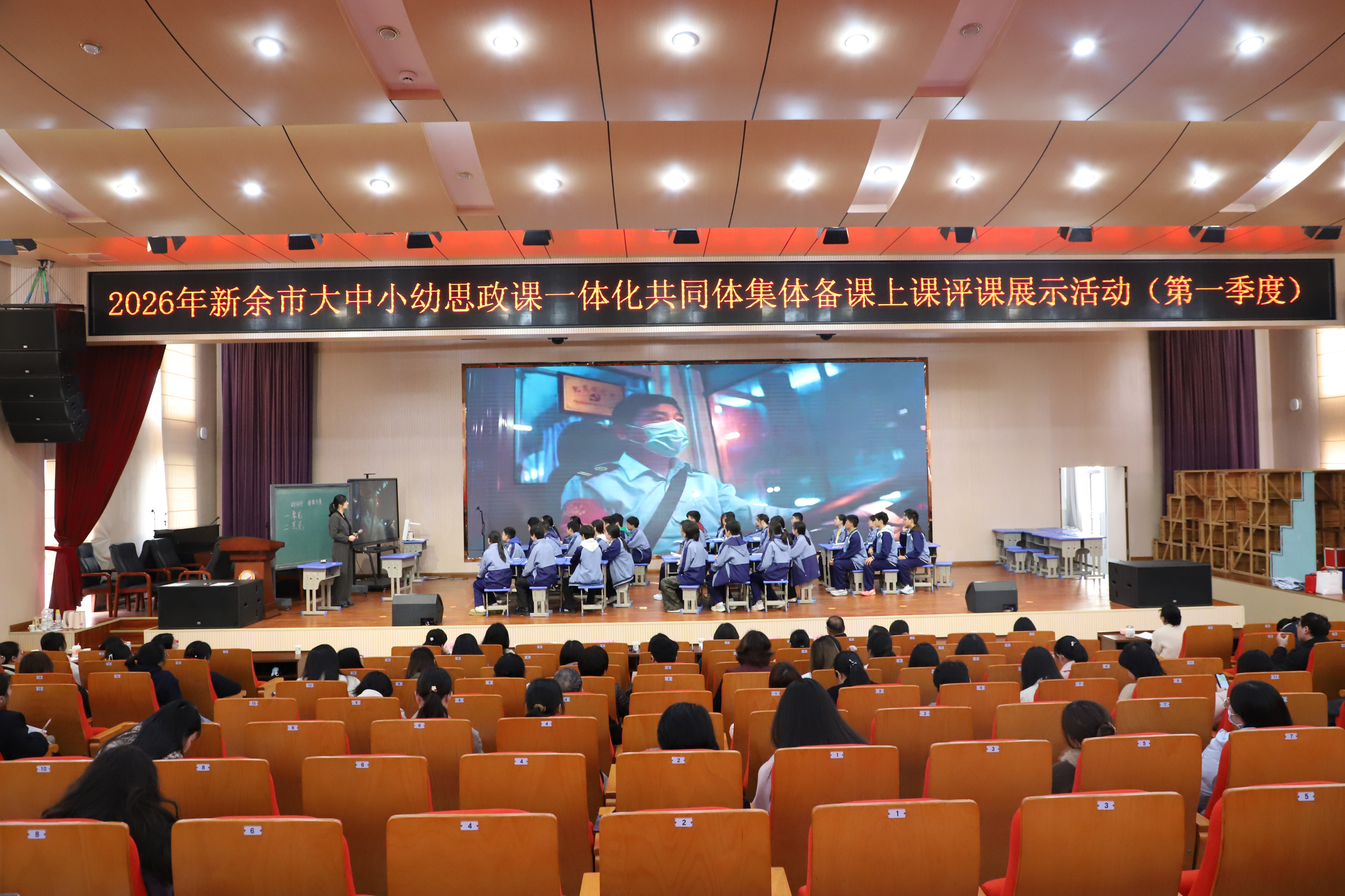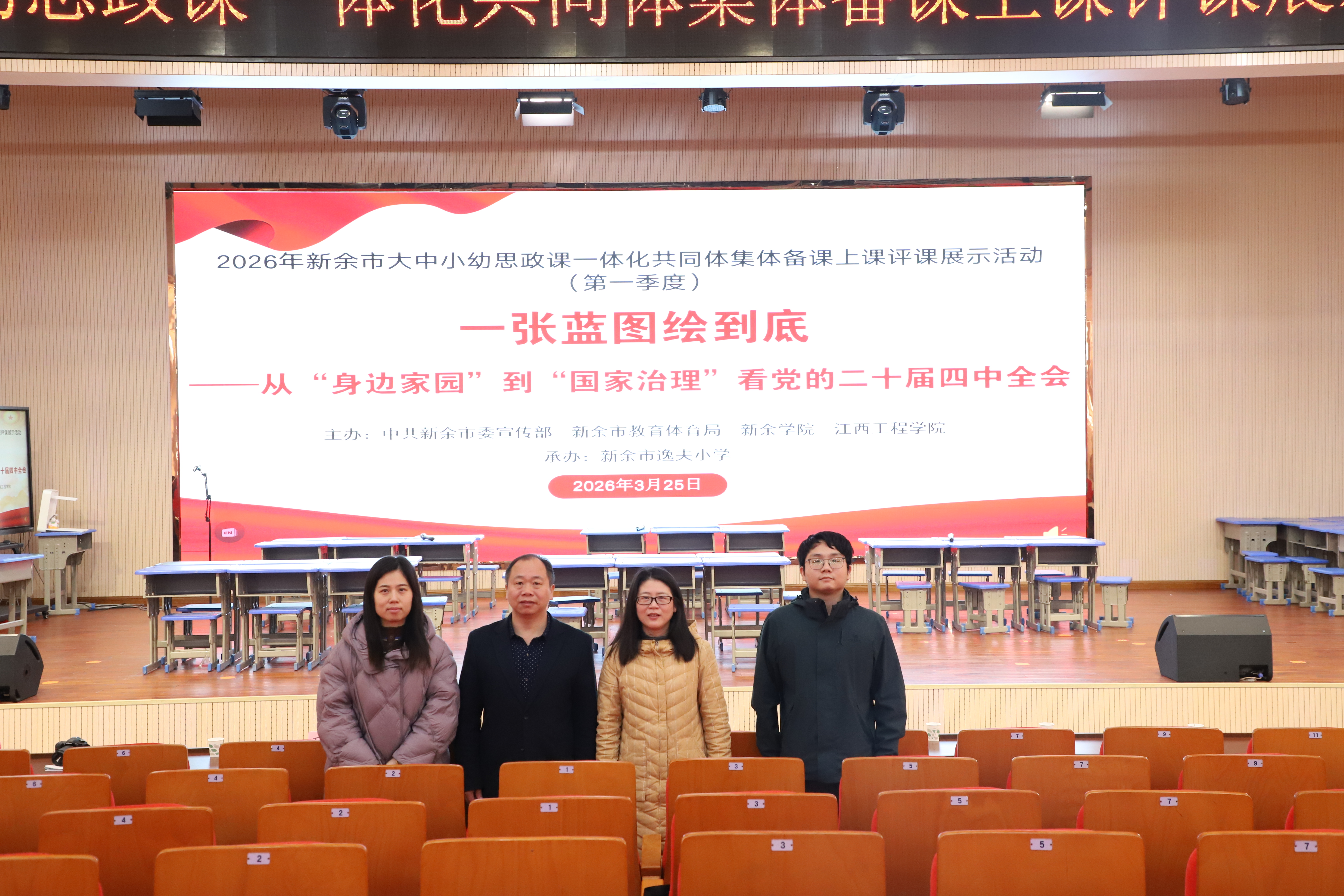 为深入贯彻《教育强国建设规划纲要(2024-2035年)》精神,扎实推进新余市大中小幼思政课一体化建设,2026年3月25日,由中共新余市委宣传部、新余市教育体育局、新余学院、江西工程学院联合主办的2026年全市大中小幼思政课一体化共同体集体备课、上课、评课活动在市逸夫小学正式启幕。作为主办方之一,江西工程学院高度重视此次活动,组织马克思主义学院于永清、黄琴、刘丽、周理斌四位思政课教师全程参与,与全市四百余名思政教育工作者齐聚一堂,共研党的二十届四中全会精神,共商思政育人协同路径。