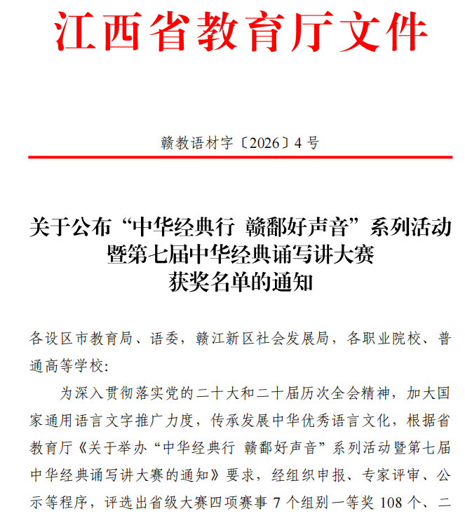 近日,省教育厅正式公布“中华经典行 赣鄱好声音”系列活动暨第七届中华经典诵写讲大赛获奖名单,江西工程学院选送的留学生作品《将进酒》《再别康桥》分别荣获诵读大赛留学生组一等奖和三等奖,展现了学校在留学生中华经典文化教育方面的丰硕成果。