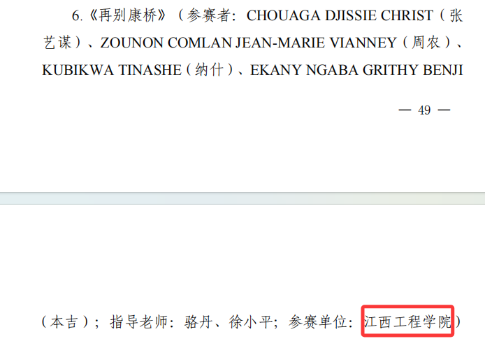江西工程学院一等奖获奖作品《将进酒》由留学生EBONG IFIOK NATHANIEL(天乐)、MAX PHOENIX(王凤凰)、BOUDIMBOU EXCELLENT MERVEIL(优秀)共同演绎,张捐捐、陈璐两位老师担任指导。三位留学生以饱满的情感和准确的语音语调,将李白这首传世名篇的豪迈气概与人生感悟诠释得淋漓尽致,充分展现了他们对中华经典诗词的深刻理解与热爱。