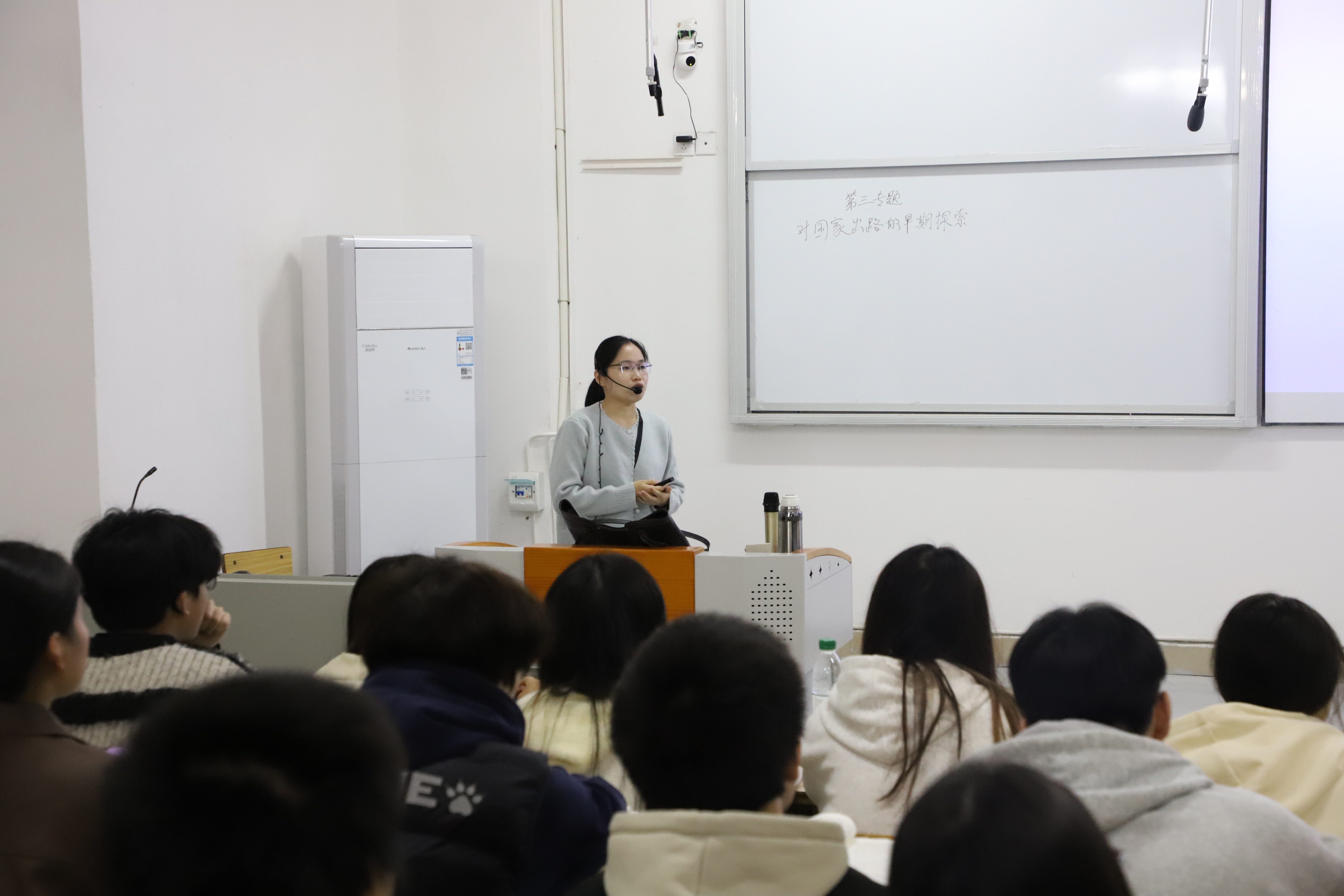 为全面掌握课堂教学运行实况,强化教学质量全过程监控,扎实推进本科教学工作合格评估与新时代思政课高质量建设,3月30日上午,校党委副书记、校长刘新跃深入天工校区C栋106教室,现场观摩马克思主义学院刘彩芸老师主讲的《中国近现代史纲要》课程,与电子信息工程学院2025级电子信息工程本科2班、3班同学一同听课学习。