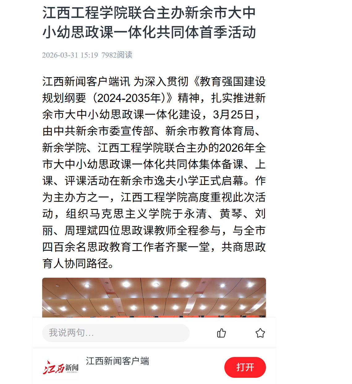 江西新闻客户端讯为深入贯彻《教育强国建设规划纲要(2024-2035年)》精神,扎实推进新余市大中小幼思政课一体化建设,3月25日,由中共新余市委宣传部、新余市教育体育局、新余学院、江西工程学院联合主办的2026年全市大中小幼思政课一体化共同体集体备课、上课、评课活动在新余市逸夫小学正式启幕。作为主办方之一,江西工程学院高度重视此次活动,组织马克思主义学院于永清、黄琴、刘丽、周理斌四位思政课教师全程参与,与全市四百余名思政教育工作者齐聚一堂,共商思政育人协同路径。