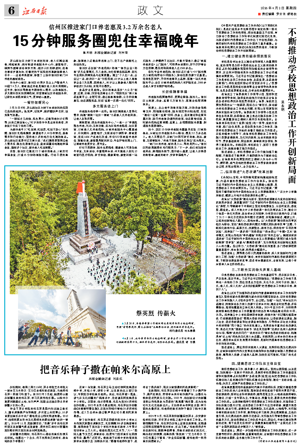我省出台《关于加强和改进新时代普通高等学校学生工作的指导意见》,坚持将解决思想问题与解决实际问题紧密结合,切实将思想政治工作有效融入人才培养各环节、全过程。加强“一站式”学生社区内涵建设,持续推动各方育人资源下沉学生中间,建成全时空贯通、多场景联动、宽领域覆盖的立体化育人网络。2024年至2025年,分别获得教育部高校思想政治工作质量提升综合改革与精品建设项目20项、25项。探索建立中小学校国情研学制度,持续开展“牢记嘱托强国有我行走赣鄱感恩奋进”暑期大思政实践活动,让思政课走出课堂、融入社会,促进思政课堂和社会课堂有效融合,引导师生在社会大课堂中深刻领悟“两个确立”的决定性意义。发挥我省丰富的红色资源优势,常态化开展“诵读红色家书讲述英烈故事”巡演红色育人品牌活动56场,唱响“我的井冈行”“我的苏区行”等红色思政实践活动,构建具有“红土地”特色的文化育人生态圈。实践表明,从学生的日常生活出发,满足学生成长发展需求和期待,是新时代提高学校思想政治工作实效性的关键。