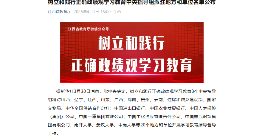 据新华社3月30日消息,党中央决定,树立和践行正确政绩观学习教育8个中央指导组将对山西、辽宁、江西、山东、广西、海南、贵州、云南;住房和城乡建设部、国家文物局、中华全国供销合作总社;中国进出口银行、中国农业发展银行、中国人寿保险(集团)公司、中国一重集团有限公司、中国中化控股有限责任公司、中国宝武钢铁集团有限公司;南开大学、武汉大学、中南大学等20个地方和单位开展学习教育指导督导工作。