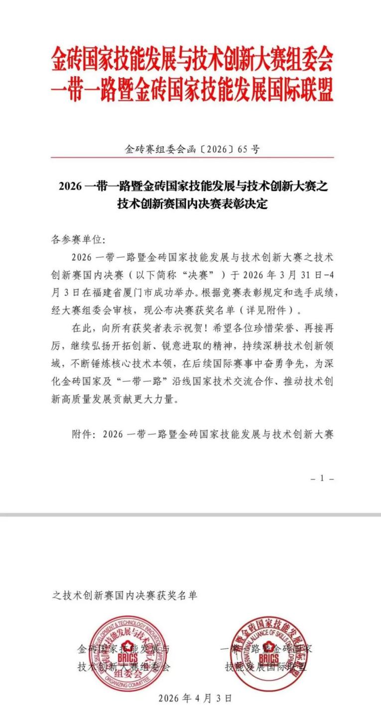 近日,2026年“一带一路”暨金砖国家技能发展与技术创新大赛之技术创新赛国内决赛在福建省厦门市圆满落幕。本次大赛自启动以来,共吸引561家单位报名参赛,涵盖西北工业大学、国防科技大学等国内顶尖高校代表队同台竞技,经过层层遴选,最终由江西工程学院人工智能与数据科学学院杨钧、王恒、陈凯、涂领先、胡紫萌五位同学组成的参赛团队,凭借扎实的专业功底、突出的实践创新能力和默契的团队协作,在众多强手中脱颖而出,成功斩获全国三等奖。
