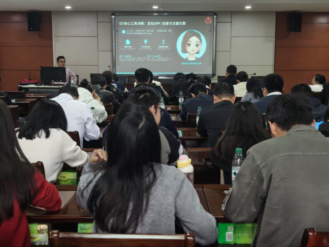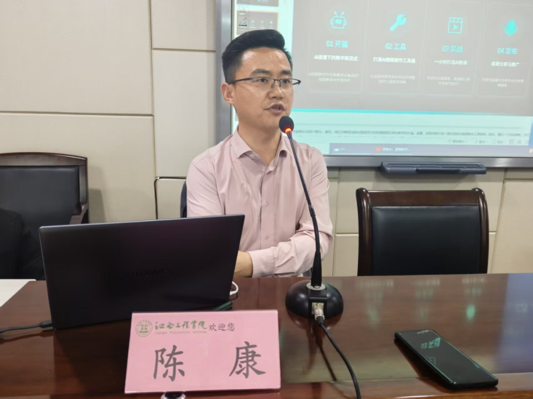培训中,陈康结合人工智能与数据科学专业特色,从AI视频制作工具实操、教学视频创作逻辑、学科融合应用路径三大维度展开讲解,系统演示了AI脚本生成、智能分镜设计、高清视频渲染、后期智能剪辑等核心技能。