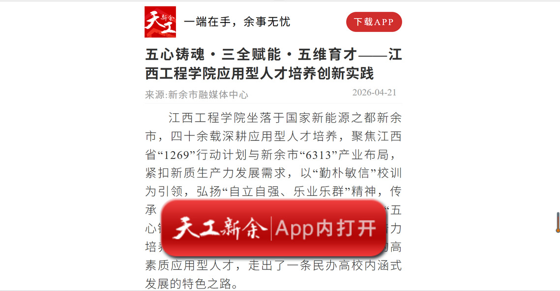 江西工程学院坐落于国家新能源之都新余市,四十余载深耕应用型人才培养,聚焦江西省“1269”行动计划与新余市“6313”产业布局,紧扣新质生产力发展需求,以“勤朴敏信”校训为引领,弘扬“自立自强、乐业乐群”精神,传承《天工开物》创新品格与工匠精神,构建“五心铸魂、三全赋能、五维育才”育人体系,着力培养具有家国情怀、创新精神、实践能力的高素质应用型人才,走出了一条民办高校内涵式发展的特色之路。