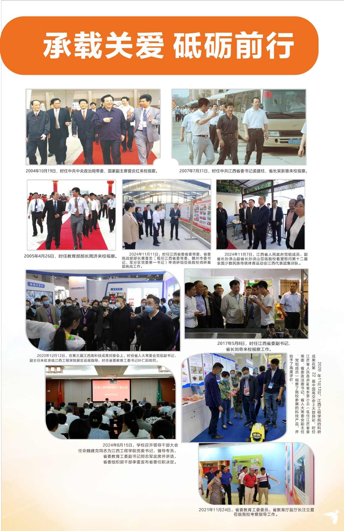 江西工程学院在国家、省、市领导的关心和支持下,不断茁壮成长。学院始终坚持以马克思列宁主义、毛泽东思想、邓小平理论、“三个代表”重要思想、科学发展观、习近平新时代中国特色社会主义思想为指导,坚持社会主义办学方向,与时俱进,开拓创新,使学院各项工作取得了显著成绩。42年来,走出了一条在小城市创办大学校,突破小区域、辐射大中国的成功之路。